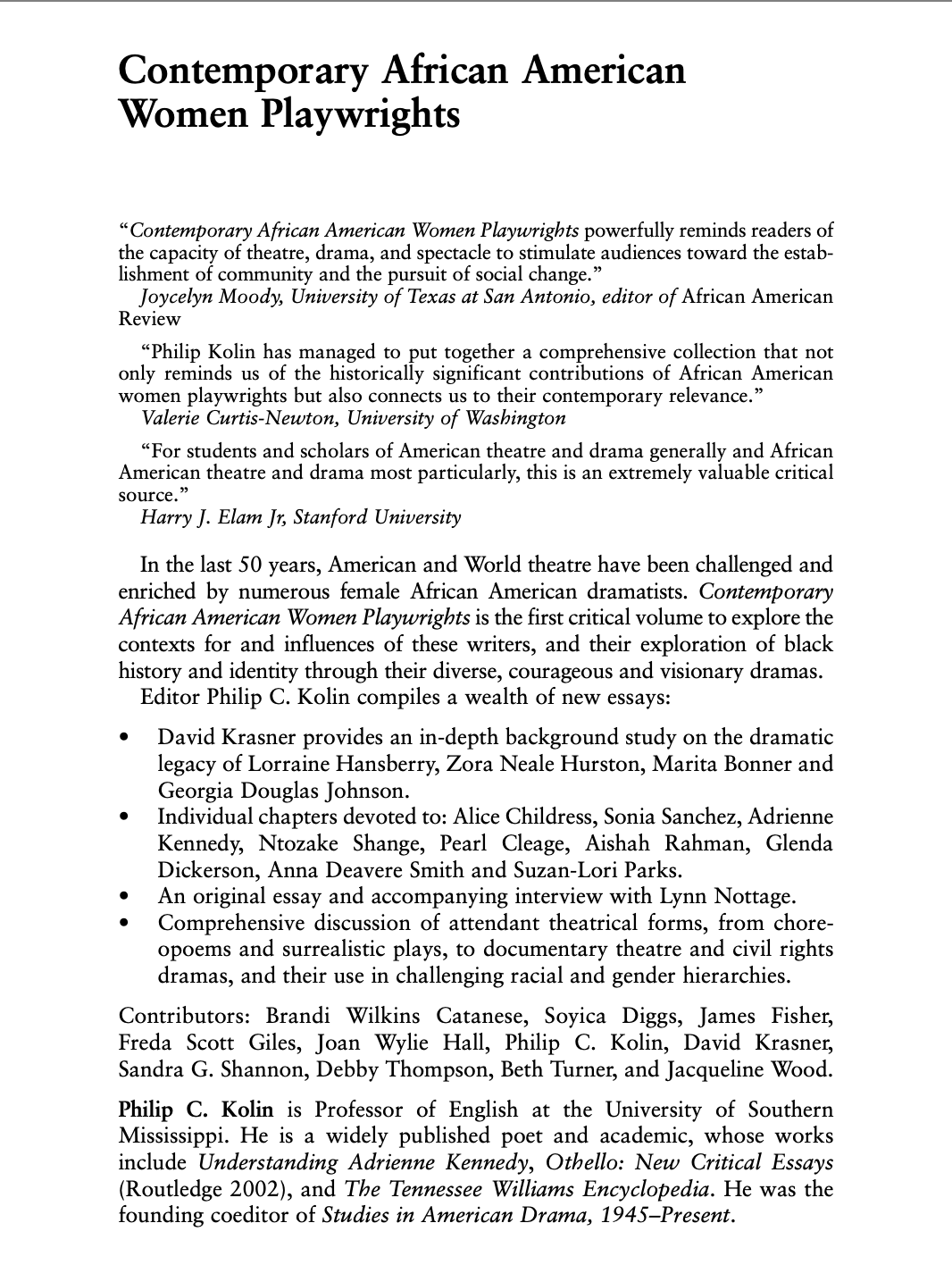 Professor: He is a Professor of Acting, Directing, Black Theatre, Black Studies, and Stage Management. He has taught at various institutions, including Ohio University, The College of Wooster, Denison University, Macalester College, Susquehanna University (as artist-in-residence), and SUNY Potsdam.