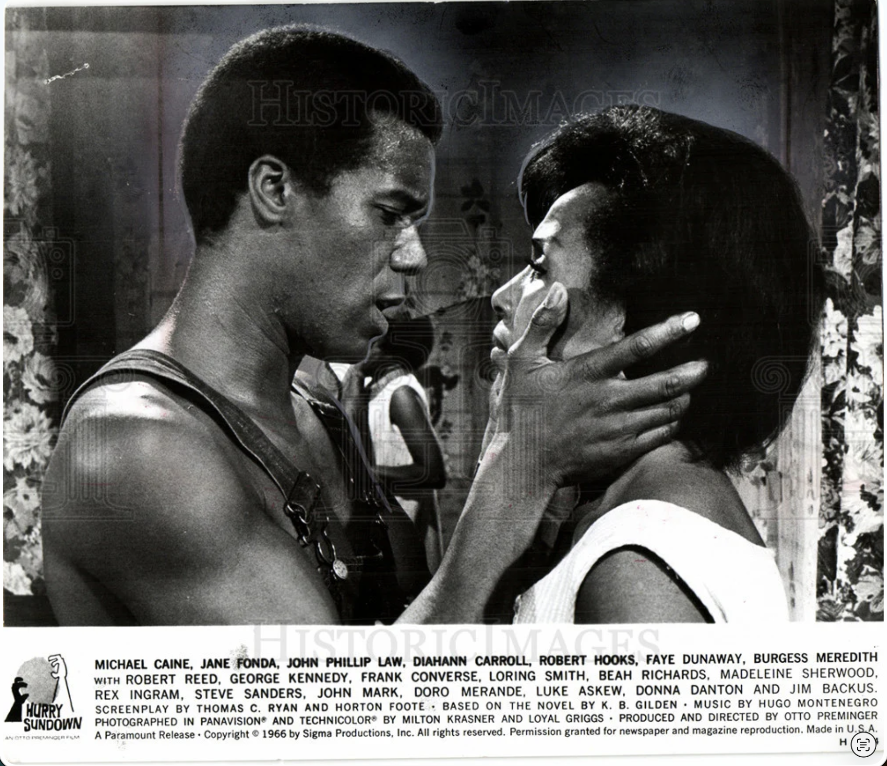 “Otto Preminger’s deep South film adventure “Hurry Sundown” (circa 1964) was the first major motion picture with two Black actors receiving Star Billing ABOVE the main title of the movie. Diahann Carroll and I had that rare honor. Sundown was filmed completely in racist, KKK infested Baton Rouge Louisiana, with racist Klan members taunting the company as we moved from location to location. There were even Klan members actually IN the film as extras (my stand-in, a local educator named Prince O. Whales would point them out to me as we worked our scenes), and there were awful, dangerous times when the company was shot at as we traveled to and from location sites. Dear Beah Richards, (who played my mother) and I, had to hit the floor of the car transporting us back to our hotel. Still Hurry Sundown turned out to be a wonderful and classic major movie.”