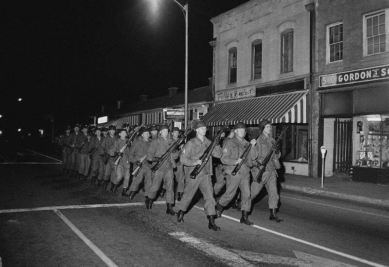 South Carolina National Guard troops marching in the streets of Orangeburg, South Carolina, February 1968, image by Bill Barley, courtesy of South Carolina Political Collections, University of South Carolina.