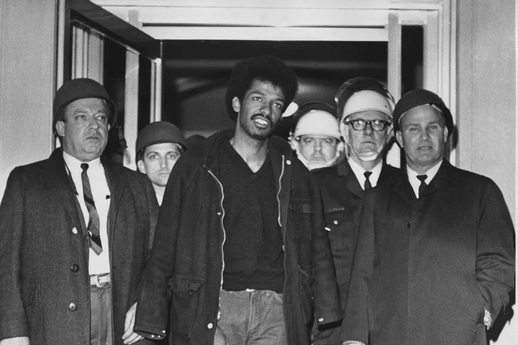 Cleveland Sellers, center, stands with officers after his arrest in Orangeburg, S.C., where three were killed and 28 others wounded on Feb. 8, 1968. AP Photo